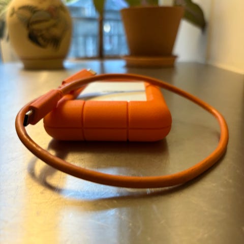 LaCie Rugged 1TB ekstern harddisk med orange beskyttelsescover. Pre-formatteret til NTFS (Windows), men kan også formatteres til Mac, hvis ønsket. Designet til at modstå stød og slag, hvilket gør den egnet til transport og brug i krævende miljøer. Tilsluttes via USB-port. Passer til opbevaring og sikkerhedskopiering af data. Brugt til ekstern lagring, dvs kørt få timer.