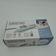 Braun ThermoScan digital øretermometer med LCD-display. Designet til at måle kropstemperatur via øret. Hvid farve og ergonomisk form for nem håndtering.
