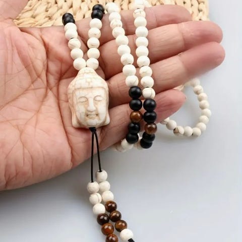 Flot lang halskæde af sorte glasperler og presset turkis perler. Perlerne er 6 mm og kæden uden lås er 80 cm. Budda hovedet af presset turkis er 2,5x3 cm og med en flot højde. Den lange pyntekvast er 7 cm og er i beskyttende plastic, indtil du får halskæden. Se også nærbilledet. Vægt 60 gram