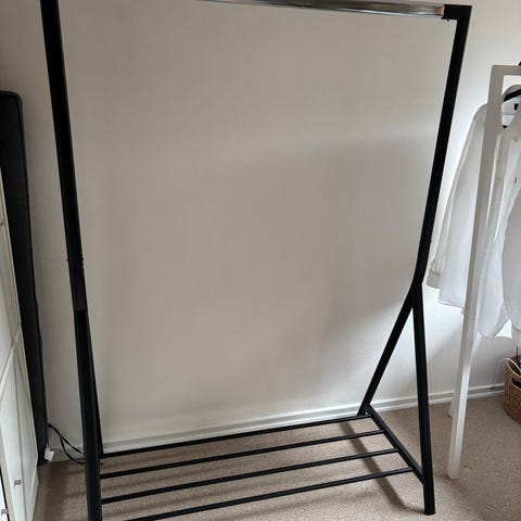 Flot sort metal Tøjstativ / garderobestativ til garderoben eller værelset. Se mål på billederne. Med hylder og bøjlestænger.