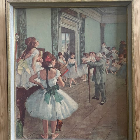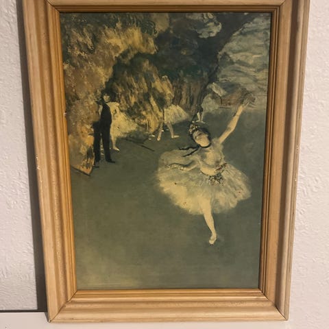 Andet, Edgar Degas, motiv: Balletpiger, b: 63 h: 69, Ventende balletpiger b: 63 h: 69. tryk/plakat eller andet ved ikke i hvid ramme. Grøn rødlig nuancer. gammelt men fin. prisen er sat ned til 2oo.