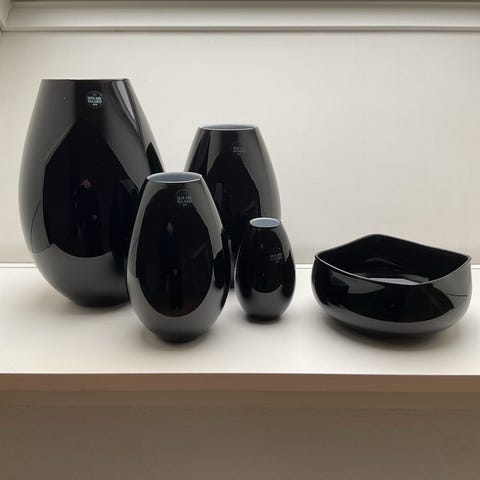 Holmegaard Vaser og Skål i rød glas. Sættet indeholder to vaser i forskellige størrelser og en skål. Produkterne er lavet af glas og har en rød farve.