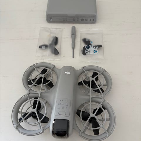 DJI neo drone med fire propellerbeskyttere og tre ekstra batterier. Dronen er kompakt og velegnet til luftfotografering og rekreativ brug.