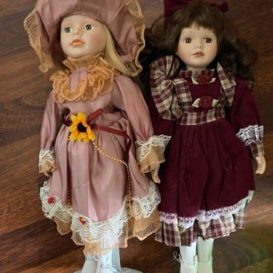Fine porcelænsdukker. Købt for ca 15 år siden. Der er lidt skjolder på kraven på den ene