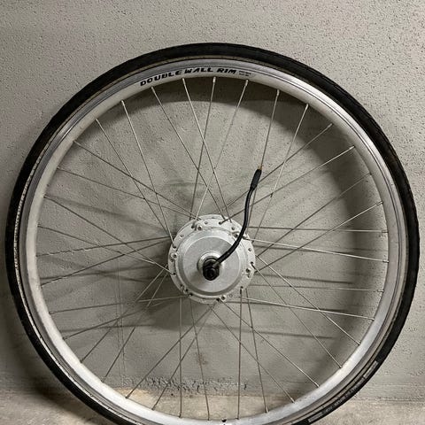 Sælges forhjul til elcykel med integreret motor og tilhørende elektrisk ledning med stik.