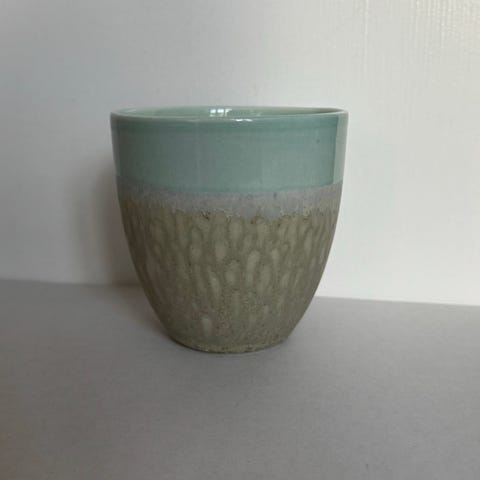 Jeg ved desværre ikke hvor mange cl. der kan være i koppen, men det er ikke mange :-) Koppen måler 7 cm. I højden (med fod) og 6,5 cm. I bredden (uden hank)