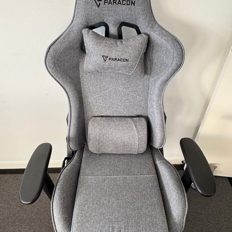 Paracon gaming stol med gråt stofbetræk. Stolen har justerbare armlæn og inkluderer nakkepude samt lændepude for ekstra støtte. Designet med ergonomisk form for komfort ved længere tids brug.