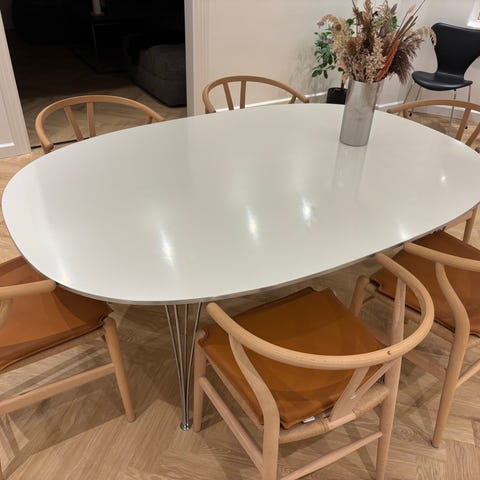 Elegant og tidløst Piet Hein bord i klassisk superellipse-design. Bordet har hvid laminatbordplade og krom stel, som passer perfekt ind i både moderne og klassiske hjem.