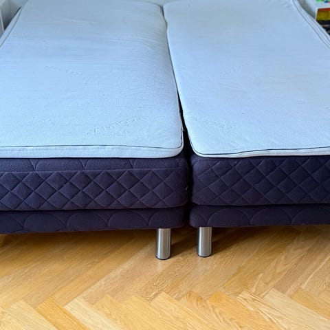 Ilva elevationsseng med fjernbetjening. Højre side er medium og venstre side er fast. Fjernbetjeningen på højre del virker og er i drift. På venstre side er den ikke i drift og jeg er u tvivl om den virker. Farven er mørkeblå. Materialet på sengen omfatter polstring med tekstilbetræk. Sengen er designet til voksne. Fra et dyre- og røgfrit hjem. Skal kun ned fra 1. Sal i et hus.