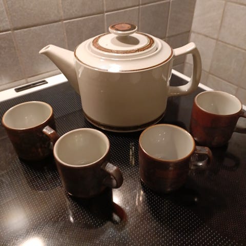Dorte Visby keramik tekande med brun og beige glasur. Tekanden har en rund form med hank og tud. Den er håndlavet og signeret i bunden. Materialet er keramik.