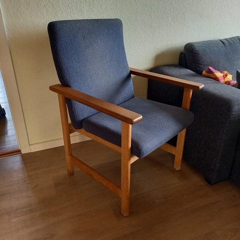 Armstol, stof, Høng stolefabrik, Bøgetræs stel lakeret m runde ben , højrygget fast ryg.