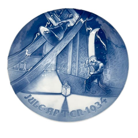 Den klassiske (23 cm) 5 års jule jubilæumsplatte fra Bing & Grøndahl fra 1920: 1895-1920 - Kirkeklokker. Dette motiv blev også anvendt på dem almindelige juleplatte i 1900.