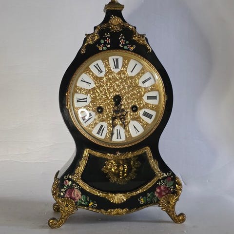 Gammel træ bordurur fra Tyskland, kasteelpendule eller skorstenur, mekanisk Pfeilkreuz–Junghans urværk, lange dages værk, slår hver halve time med en gong, emaljeret urskive med romerske numerals, messing- og bronzebeslag, mål 45 × 27 × 16 cm, vægt 3237 g, opptiningsnøgle inkluderet, i god brugt stand og i gang. Klik på den blå "gå til varen" knap, for at købe eller byde på denne vare. Den samlede pris vil blive vist inden du afgiver dit bud.