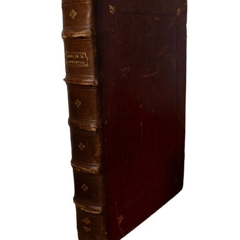 Gammelt kartonnage dækket af papir, glat ryg med gammelt håndskrevet titel.
