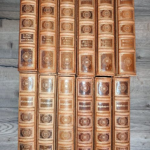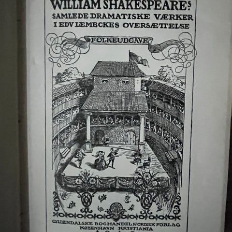 Sexbinds tysk illustreret udgave af Shakespeares dramatiske værker oversat af Aug. Wilhelm v. Schlegel og Ludwig Tieck, udgivet af G. Reimer (Berlin) i 1843 (3. udgave), bindet i dekorativ halvhårsbind med guldbemaling, rigt illustreret med helside stålstik, ca. 2400 sider, i god stand. Klik på den blå "gå til varen" knap, for at købe eller byde på denne vare. Den samlede pris vil blive vist inden du afgiver dit bud.