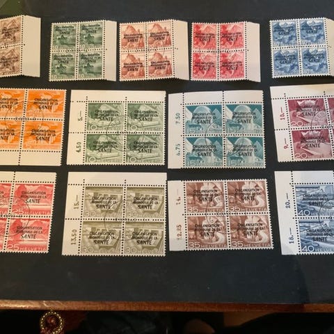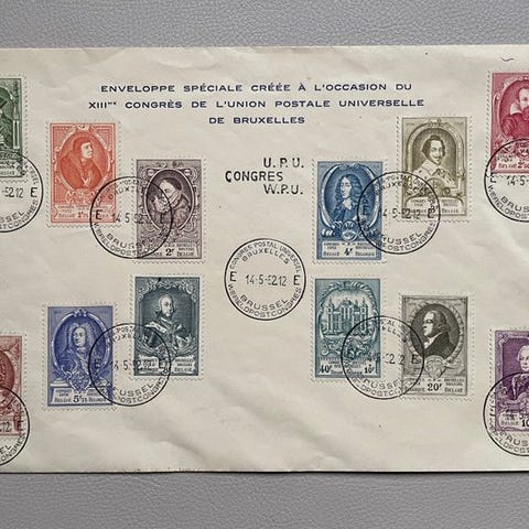 Belgisk oprindelse; 13. UPU-kongres – fuld serien i blokke af 4, frimærker uden gum; udgivet i 1952; katalog COB/OBP 880/891; et frimærke viser alderspletter ifølge scans. Klik på den blå "gå til varen" knap, for at købe eller byde på denne vare. Den samlede pris vil blive vist inden du afgiver dit bud.