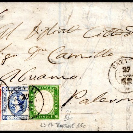 Blandet udgave fra Regno d’Italie og Sardinien med to 20-cents værdier, begge i indigo farve med violet refleksioner, brugt på et brev sendt den 30.11.1862 fra Bari til Nizza Marittima; annulleret med adresse, certificeret af eksperten Enzo Diena og underskrevet af Grioni; katalogiseret Sassone n. 15Ea og Regno n. 2a. Klik på den blå "gå til varen" knap, for at købe eller byde på denne vare. Den samlede pris vil blive vist inden du afgiver dit bud.