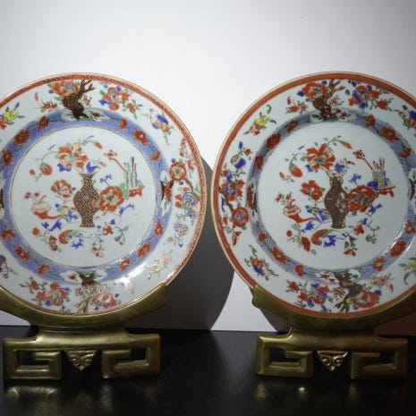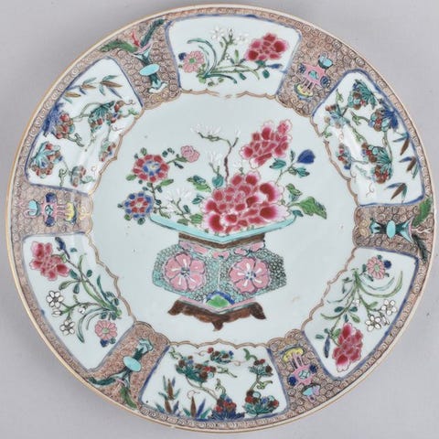 Et meget fint kinesisk famille rose-plate dekoreret med figurer i et kinesisk landskab.