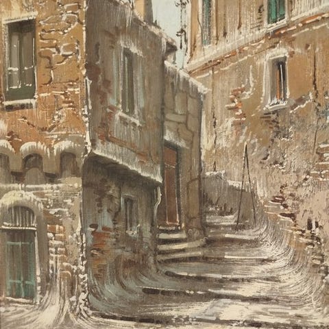 Nino Caffè, landskab med titlen Vento Impetuoso, 1959, olie på træpanel med museal ramme, 42×59 cm, håndsigneret, originaludgave. Klik på den blå "gå til varen" knap, for at købe eller byde på denne vare. Den samlede pris vil blive vist inden du afgiver dit bud.