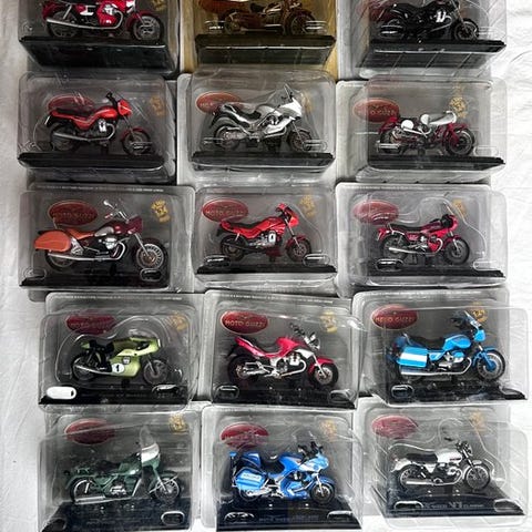 femten Moto Guzzi modeller i skala 1:24 i originalemballage, af plastik, i næsten ny stand, tilgængelige i rød, grøn og sort. Klik på den blå "gå til varen" knap, for at købe eller byde på denne vare. Den samlede pris vil blive vist inden du afgiver dit bud.