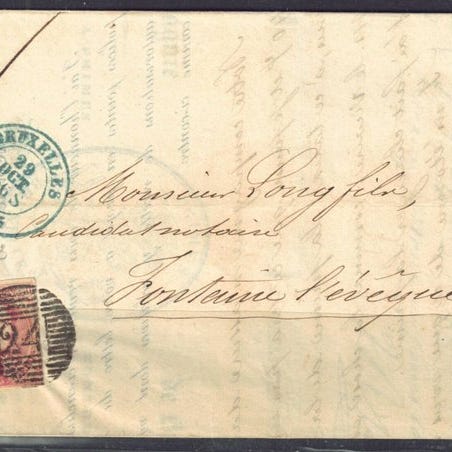 1. 10000 Frs fra Notaire Glorieux i Tournai til Société Générale de Lille. Stempler på frimærker TOURNAI VALEURS den 27. december 1899. Stempel fra Lille-Gare Nord dagen efter og Lille-Nord dagen efter igen. Afregnet med porto 4,10 Frs med Fine Barbe 2 x 2F lilla på rosa (COB 66) og 1 x 10c rødbrun (COB 57).