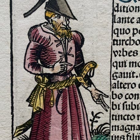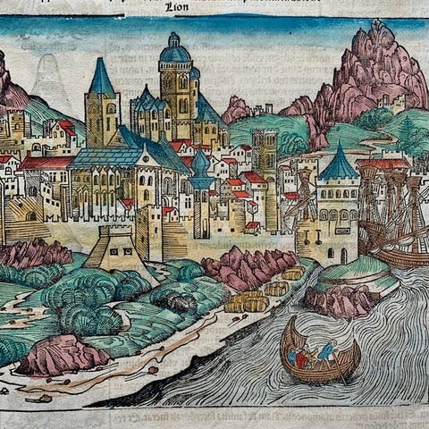 Enkelt folioark - nr. 267, fra den første tyske udgave af Nürnberger Chronik 1493 [ca. 500 eksemplarer trykt]. Teksten er illustreret med i alt 1 fint farvet træsnit, [3/4 side].