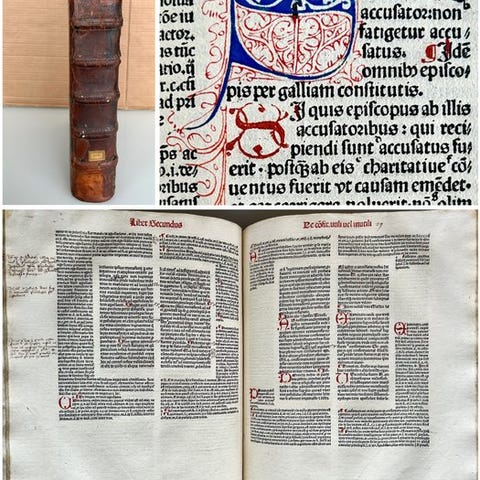 Denne bog, *Decretum Gratiani* (The Gratian Laws), samlet af juristen Gratianus i det 12. århundrede, er et grundlæggende værk inden for middelalderlig canonret og det europæiske retssystem, og forblev et centralt tekst i universitets juridiske uddannelse i århundreder.