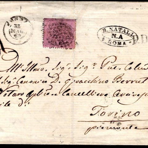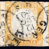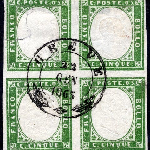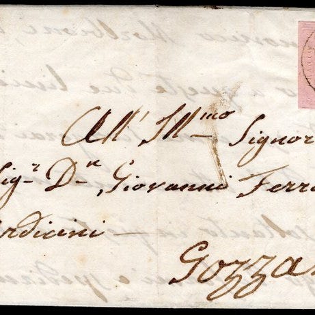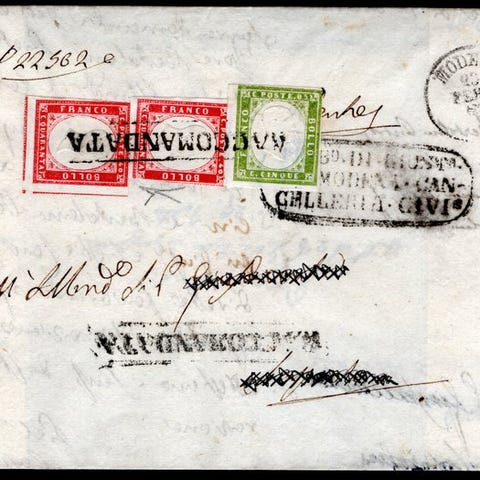 De venstre frimærker annulleres med en sardo-italiensk datograf med dobbelt cirkel fra Chiari.
