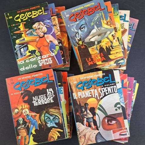Editrice Universo, hæftet, ca. 17x12 cm. Første årgang delvis komplet fra nr. 1 til 38, med undtagelse af nr. 12. Udgiver Superbone og Forza John af Niccolò, Piccola Eva af Terenghi, Rocky Rider af Uggeri, Cappuccino og Cappuccetto af Gavioli. Meget nye til kiosken. Nr. 2 med en lille rift ved den øverste kant af forsiden. Endvidere fasciklerne med blanke forsider og velbevarede. Tangene er ikke oxiderede. Små hakk i kanterne, forårsaget af den redaktionelle skæremaskine. Sjælden i denne stand.