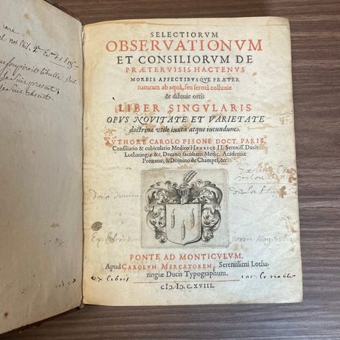 In-folio (35,6 x 23,5 cm), (4) s., 732 s., (13) s. Fuld brun kalveskindindbinding, ryg med ornamenterede støtninger, titelstykke i grenatfarvet maroquin fra det 18. århundrede, dobbelt gyldengrund omkring forsiderne, siderne med røde prikker. Indbinding fra afslutningen af det 17. århundrede. Hjørner og toppen af ryggen slidte, tranchefiles mangler, hængsler sprækker, forsider og ryg epidermiserede, manglende læder på kanterne, gardiner løsnedslåede, stykke tape på s. 121, enkelte vandpletter øverst og i slutningen af værket,