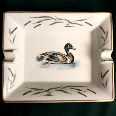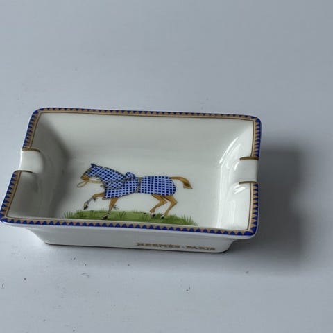 Pragtfuldt askebæger fra Christian Dior, der også kan bruges som opbevaringsbakke til småting, i porcelæn med soldekoration, signeret i foden, ingen skår, fremragende generel tilstand.
