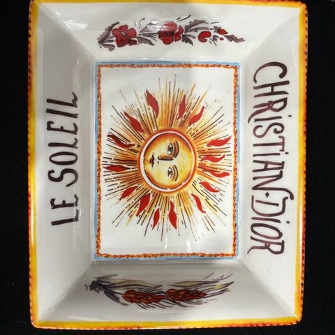 Dior porcelæn askebæger med solsdesign, også egnet som lille opbevaringsbæger, underskrevet ved foden, i fremragende stand med minimale brugsspor; model Le Soleil, målene 4 × 17 × 20,5 cm, fremstillet i Frankrig, omkring 2010–2020. Klik på den blå "gå til varen" knap, for at købe eller byde på denne vare. Den samlede pris vil blive vist inden du afgiver dit bud.
