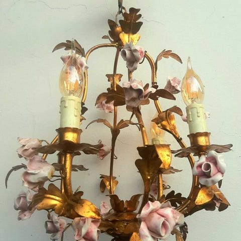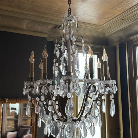 Fransk perlekrone-zakkronelysekrone (basket chandelier, sac à perle) fra omkring 1900 i rokoko-/barok stil.
