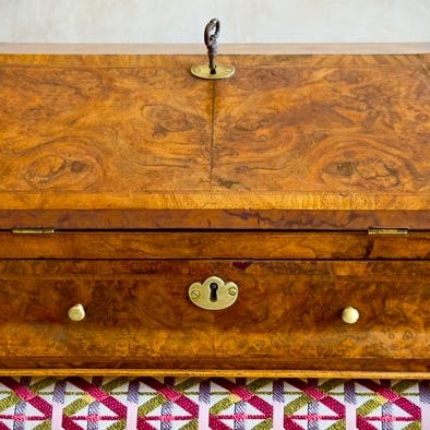 Dette er et sekretærskab, et gammelt møbel i valnøddetræ med blomsterindlæg, kendetegnet ved en vippeklap, der fungerer som skrivebordplade.