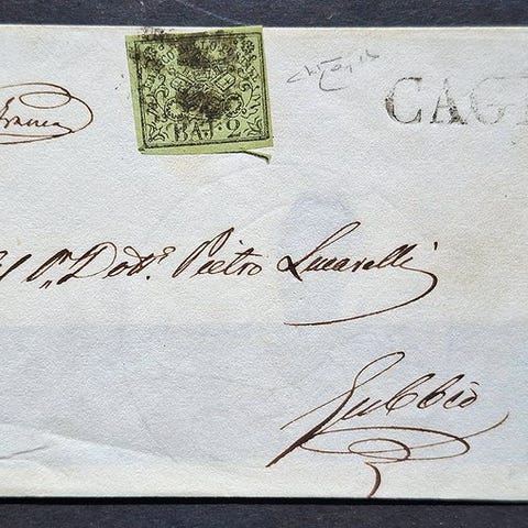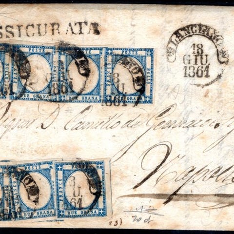 Pavelstaterne - breve sendt fra Rom til Napoli den 31/12/1857 frankeret med 2 baj i et par, hvoraf det ene er opdelt i halve + 7 baj azurblå.