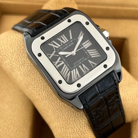 Cartier Santos 100 Large Titanium med reference W2020010, automatisk ur med stålcase med sort PVD-belægning og titanium bezel, 38 mm diameter, sort skive med romerske tal og luminescerende visere, gummibælte og original Cartier-spænde, safirglas, Swiss Made, æske inkluderet, papirer ikke inkluderet, i meget god stand og testet på timegrapher. Klik på den blå "gå til varen" knap, for at købe eller byde på denne vare. Den samlede pris vil blive vist inden du afgiver dit bud.