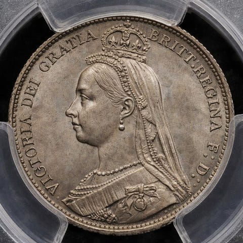 En sølvmønt præget under Anden Verdenskrig med et portræt af Kong George VI på forsiden og det kronede monogram "GRI" (Georgius Rex Imperator) på bagsiden. London Mint (mærket "KG" af gravør Kruger Gray) producerede store mængder af disse mønter, som var fundamentale for det britiske monetære system før decimaliseringen. Disse stykker har betydelig historisk værdi.