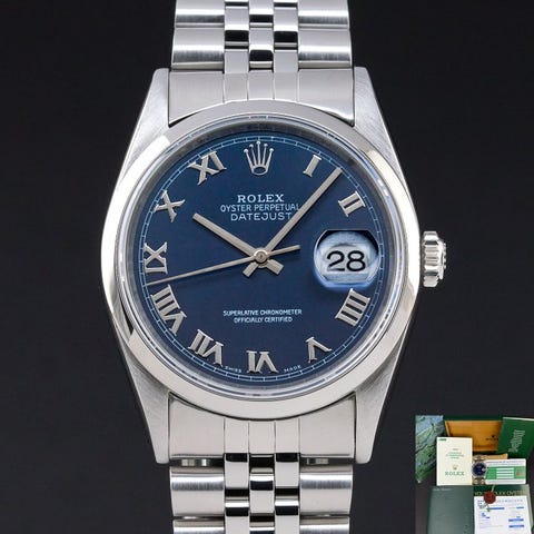 Rolex Datejust 16200, et 36 mm rustfrit stål automatic herre/kvindeur af unisex-typen fra 2003, sølvfarvet urskive, stålrem (normal længde 180–200 mm), original æske og papirer, i meget god stand med mindre brugsspor. Klik på den blå "gå til varen" knap, for at købe eller byde på denne vare. Den samlede pris vil blive vist inden du afgiver dit bud.