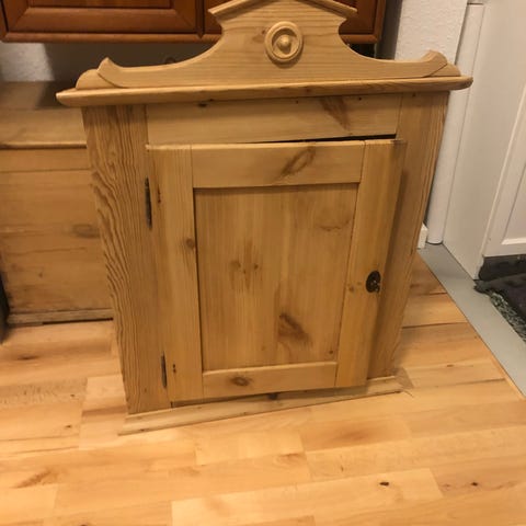 Hjørneskab, /hjørnehængt. Massiv fyr. Lakeret. Hylde kan tages ud. Samlet med dyvler - også hængslerne er af træ. Særegent og fornemt håndværk.
