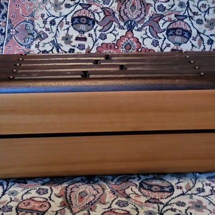 Santoor er helt håndlavet. Den har to træstænger. Der er tegn på tidligere brug på både forsiden og