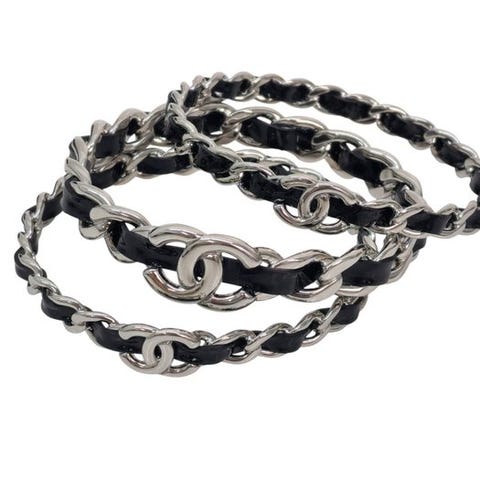 Chanel CC manchetarmbånd i bronze metal, sæt af to, samlet vægt 100 g, til kvinder, fremstillet i Italien, i god stand med brugsspor, med sort emalje og kunstige perler. Klik på den blå "gå til varen" knap, for at købe eller byde på denne vare. Den samlede pris vil blive vist inden du afgiver dit bud.