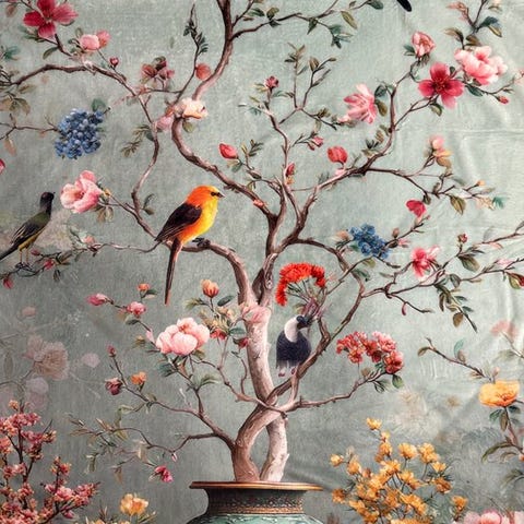 Chinoiserie-dekoren er meget raffineret og elegant i sine fremstillinger, med en smuk scene af orientalske vaser med blomstrende planter og mandelblomster, hvor småfugle står i forgrunden mod en baggrund af grønne nuancer, der blander sig. Ideelt som supplement i eksklusive omgivelser eller som et hurtigt blik i dit rum for at give det et personligt præg.