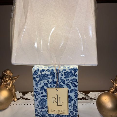 Ralph Lauren porcelæns bordlampe på en mørk træfod, kobaltblå med hvid drage-dekor, 35 × 35 × 49 cm, én fatning, ét sæt, oprindelse Kina, ny i originalt forseglet lampskær, i funktion. Klik på den blå "gå til varen" knap, for at købe eller byde på denne vare. Den samlede pris vil blive vist inden du afgiver dit bud.