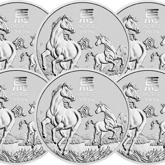 Fem 1-ounces sølvmønter Lunar III Hest 2026, 99,99% sølv, præget af The Perth Mint, Australien, samlet vægt 5 troy ounce (5 × 31,10 g). Klik på den blå "gå til varen" knap, for at købe eller byde på denne vare. Den samlede pris vil blive vist inden du afgiver dit bud.