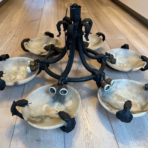 Franskfremstillet midt-iårhundredet moderne messinglampe i doré messing, organisk fiskefor, blå agat, Duval Brasseur-stil, ca. 1960-1970, 45 cm bred, 33 cm høj, 14 cm dyb, god brugt stand med små tegn på ældning, i funktionsdygtig stand. Klik på den blå "gå til varen" knap, for at købe eller byde på denne vare. Den samlede pris vil blive vist inden du afgiver dit bud.