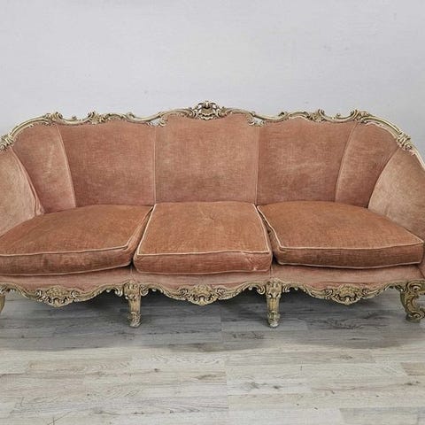 Elegant sofa i silik-stil, helt håndudskåret med blomstermotiver, fint stof, generelt i god stand.