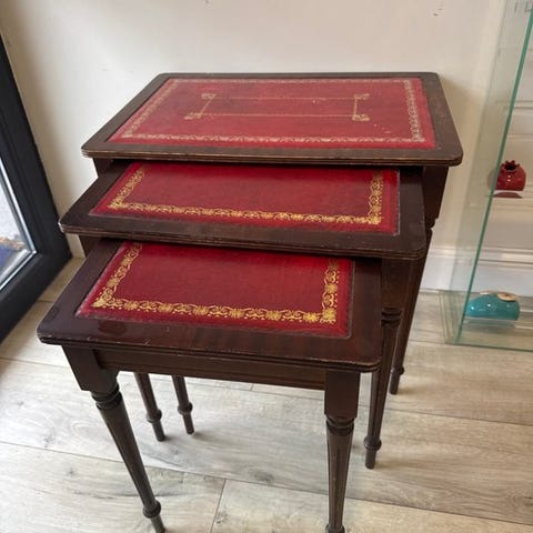 Hvidt og forgyldt indskudsbordssæt. Disse møbler er ofte i avantgarde- eller empirestil med udskårne ben og delvist forgyldt dekoration.