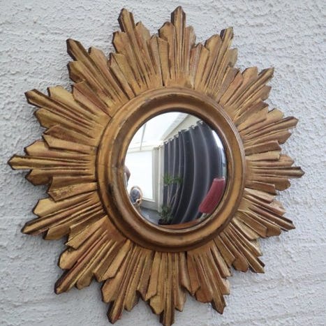 Mid-century modern solspejl fra Europa, dateret ca. 1970–1980, i guldfarve med træ, glas og metal og solstråler i resin, ét stykke, i god stand med små tegn på ældning. Klik på den blå "gå til varen" knap, for at købe eller byde på denne vare. Den samlede pris vil blive vist inden du afgiver dit bud.