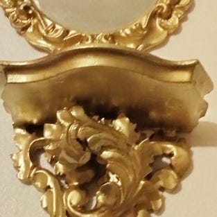 Denne konsol fra begyndelsen af det 20. århundrede er udført i håndskåret træ og har et design med tydelig neoklassisk inspiration. Dets struktur kombinerer lige linjer med elegante kurver og fremhæver en voluteprofil, der minder om de klassiske kapitæler. Kanterne er dekoreret med trinlignende moldurer og gyldne detaljer, der understreger dens arkitektoniske nærvær.