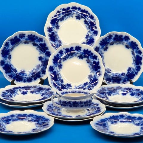 Farvetype: Cremefarvet fond med kobalblå dekoration.